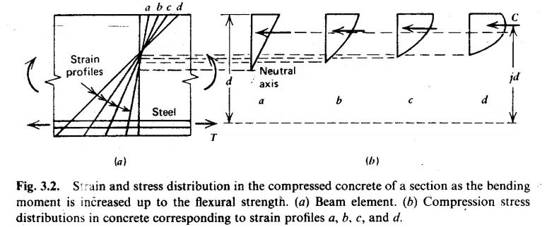 The following figure, obtained from the Book, Reinforced Concrete Structures by Park and Paulay, indicates the stress and strain development of a section.