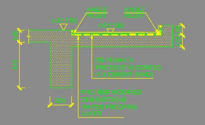 - Angle fillet shall be placed at the corner to avoid sharp bend. If cement waterproofing is applied at corners without the angle fillet, it could lead to bulging, and as a result, waterproofing may crack or may become less durable.