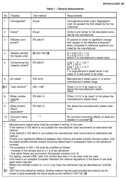 Table 02 to Table 12 of the same code shall be referred for testing procedures and requirements of the above 11 types of admixtures (categorized as per BS EN 934-2-2001). Further, all the factory production shall be tested as per the minimum requirements specified in the code.