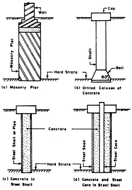 Drilled caissons are constructed up to the deeper depth when compared to the masonry/concrete pier foundations. Further, excavation for these types of foundations could be done with mechanical means.