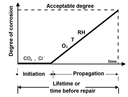 Propagation is the period from the depassivation until a certain acceptable level of deterioration is developed in the structure.