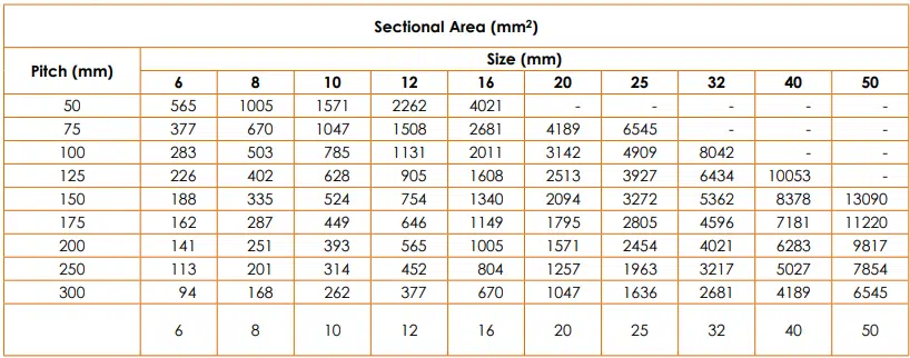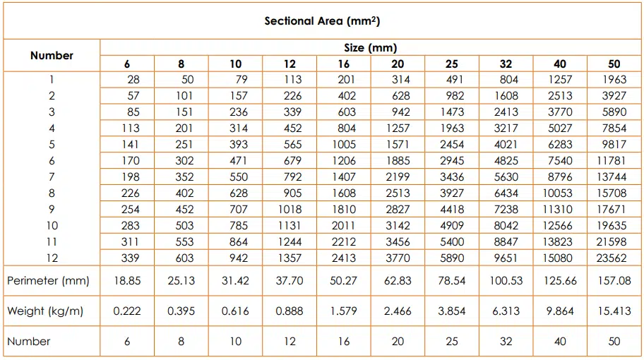 According to the British Standards, the following rebar area table can be used. It indicates the bar diameter, area of rebar, rebar area based on the number of bars, etc.