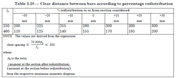 When above a, b, and c conditions do not apply, bar spacing shall be limited as following Table (Table 28 of BS 8110 Part ) where the reinforcement percentage exceeds 1% or the values given in Table 28 divided by the reinforcement percentage for lesser amounts.