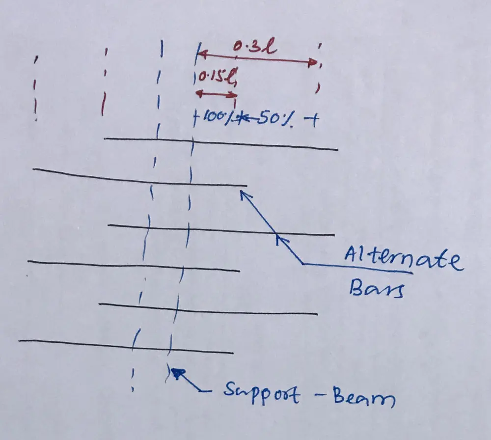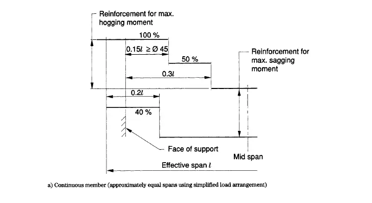 If the desing ultimate shear stress at the face of the support is less than half the appropriate Vc, a straight length of bars beyond the centerline of the support equal to either one-third of the support width or 30mm, whichever is the greater.